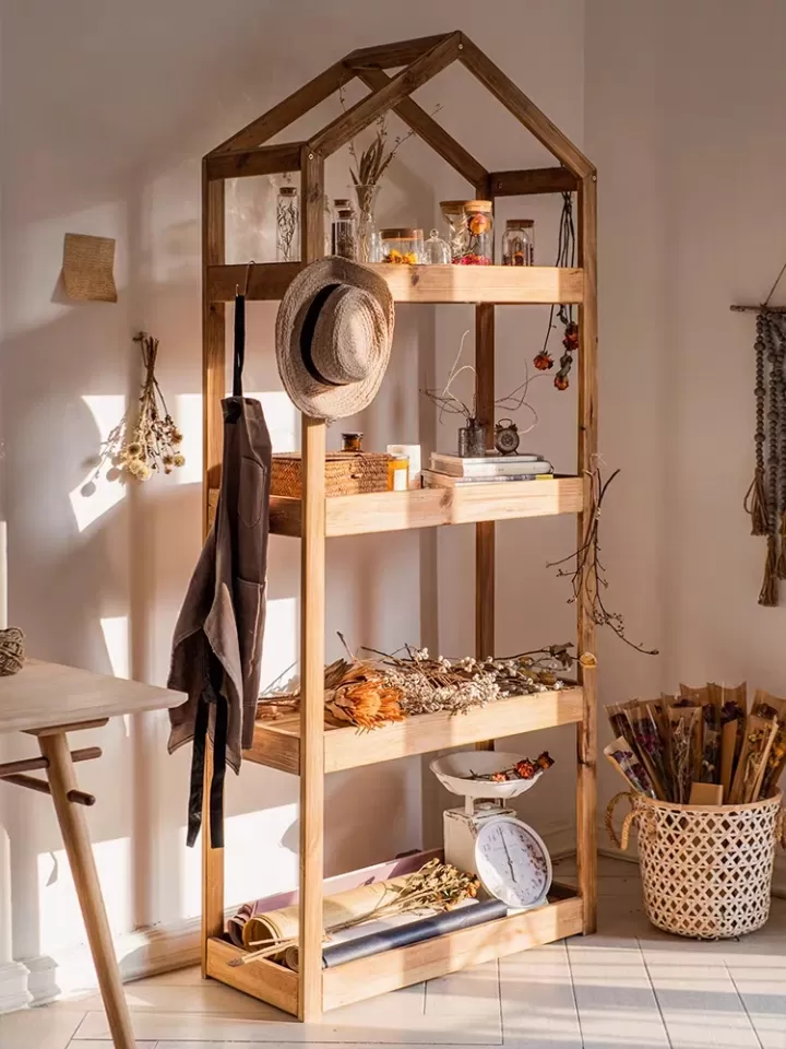 يأتي رف التخزين الديكور بتصميم فني أنيق يتخذ شكل هيكل منزل، ما يضفي عليه طابعًا جذابًا يدمج بين الحداثة والبساطة. الرفوف الأربعة الفسيحة توفر مساحة تخزين مثالية للكتب، الإكسسوارات، النباتات، والمقتنيات الشخصية، بينما يمنح الإطار العلوي شكلًا معمارياً يمنح الغرفة حضورًا فنيًا مميزًا.