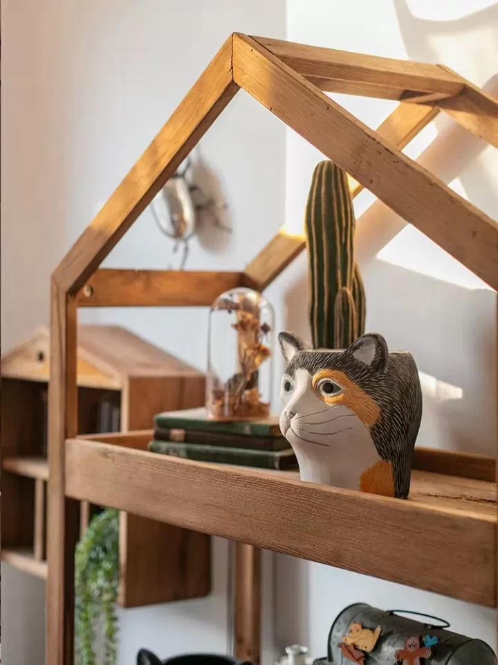 اعرض مقتنياتك المفضلة بلمسة فنية باستخدام رف تخزين ديكور خشبي بتصميم مستوحى من شكل المنزل. تضفي هذه القطعة المبتكرة حضورًا بصريًا يلفت الأنظار في أي غرفة، وتجمع بين الجمال العملي والديكور الراقي لتناسب مختلف أنماط التصميم الداخلي.