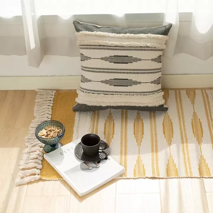 مصنوعة من قماش قطني ناعم وسهل التنظيف، وتزدان بأهداب سميكة على الأطراف، مما يجعلها واحدة من أجمل خيارات سجاد الباب وسجاد مودرن للمساحات الصغيرة.