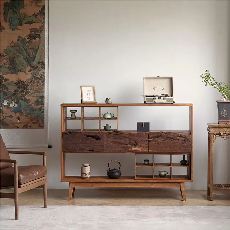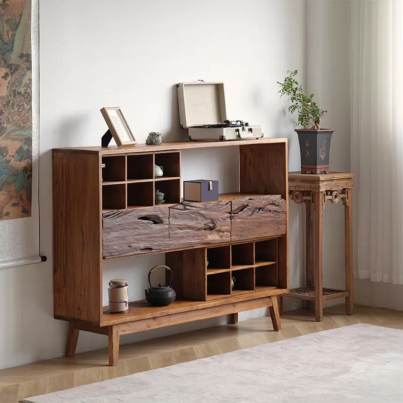 يتميز هذا المدخل الخشبي بهيكل هندسي يسمح لك باستخدامه كوحدة تخزين مفتوحة ومغلقة في نفس الوقت. الجزء العلوي مخصص للعرض، بينما تأتي الأدراج المركزية لتخزين المستلزمات، وتوفر الأقسام الشبكية المتعددة إمكانيات متنوعة لتنظيم الفناجين، الزينة، أو الكتب الصغيرة.