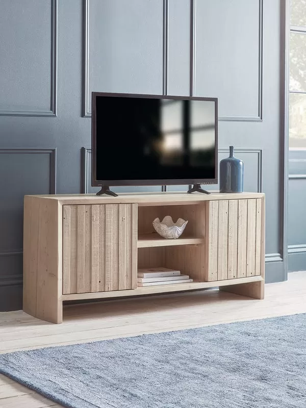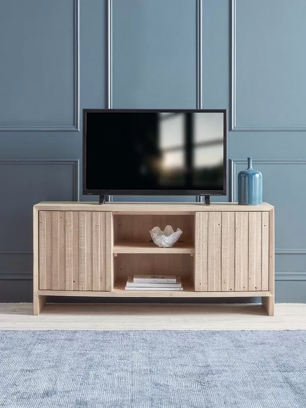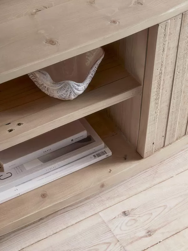 طاولة تلفزيون بتصميم ريفي أنيق، مصنوعة من خشب الصنوبر الطبيعي، تضيف لمسة دافئة وطبيعية على غرفة المعيشة.
