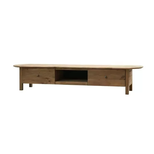 تجمع هذه الطاولة الخشبية بين البساطة والمظهر الطبيعي الهادئ. تصميمها المفتوح في المنتصف مثالي لوضع أجهزة التحكم أو الكتب، بينما يوفّر الدرجان الجانبيان تخزينًا مغلقًا يحافظ على ترتيب الغرفة. إنها من طاولات تلفزيون فخمة التي تناسب عشاق الديكور البسيط المستوحى من الطبيعة.