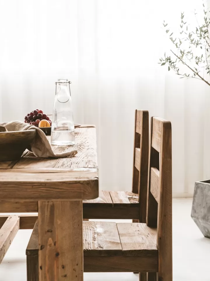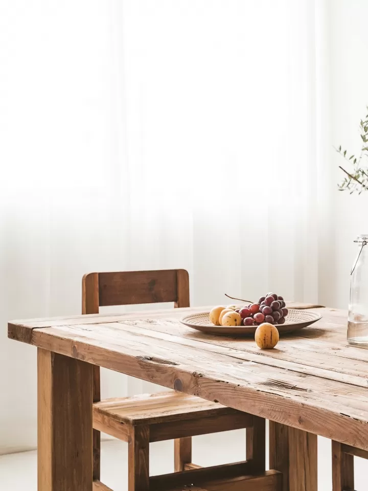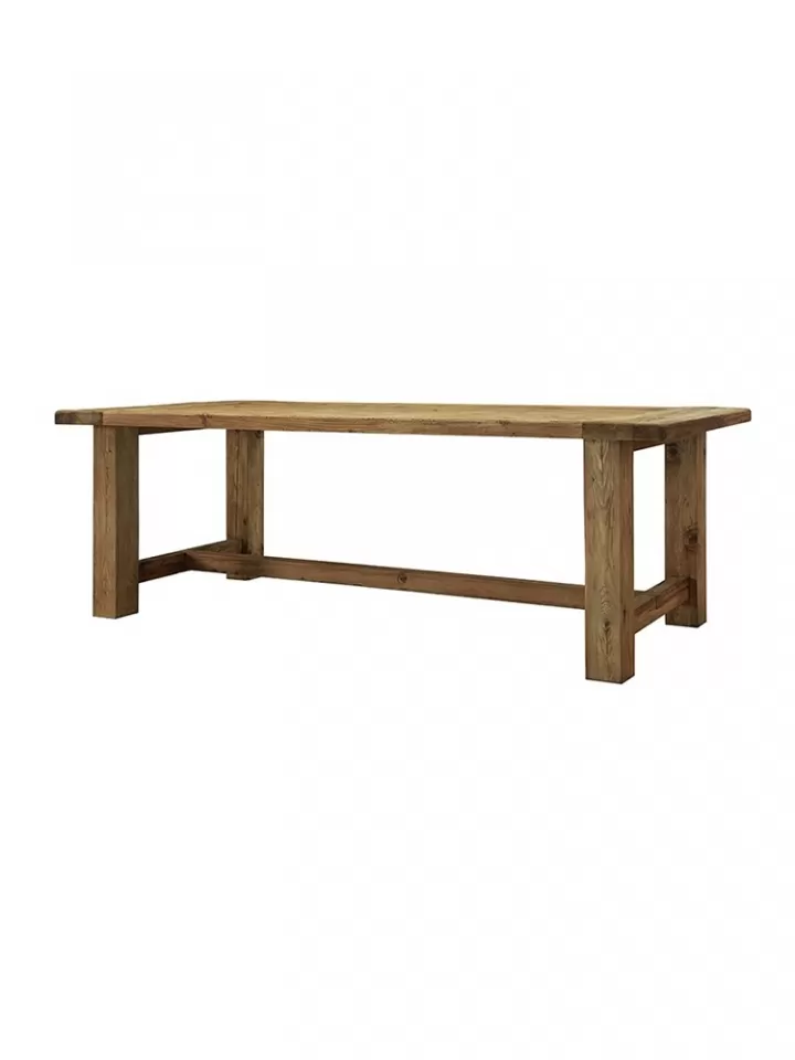 تمتاز طاولة الطعام الكبيرة بسطح خشبي واسع يبرز جمال الخشب الخام والتفاصيل الطبيعية لحبّات الخشب. الأرجل المستقيمة والعريضة تمنحها ثباتًا قويًا وأناقة بسيطة، مع قضيب داعم في المنتصف يضمن المتانة. تصميمها المستوحى من الطراز الريفي يضفي لمسة دافئة وأصيلة على المكان.