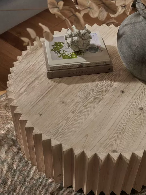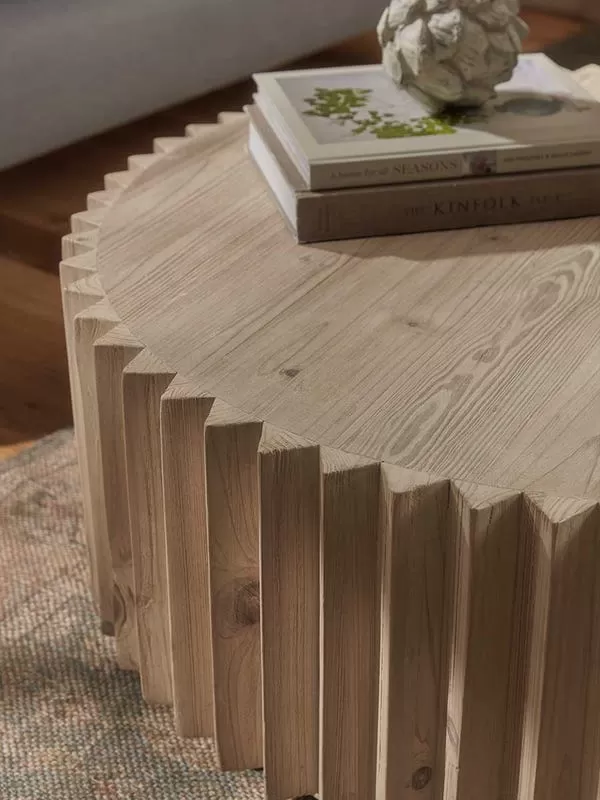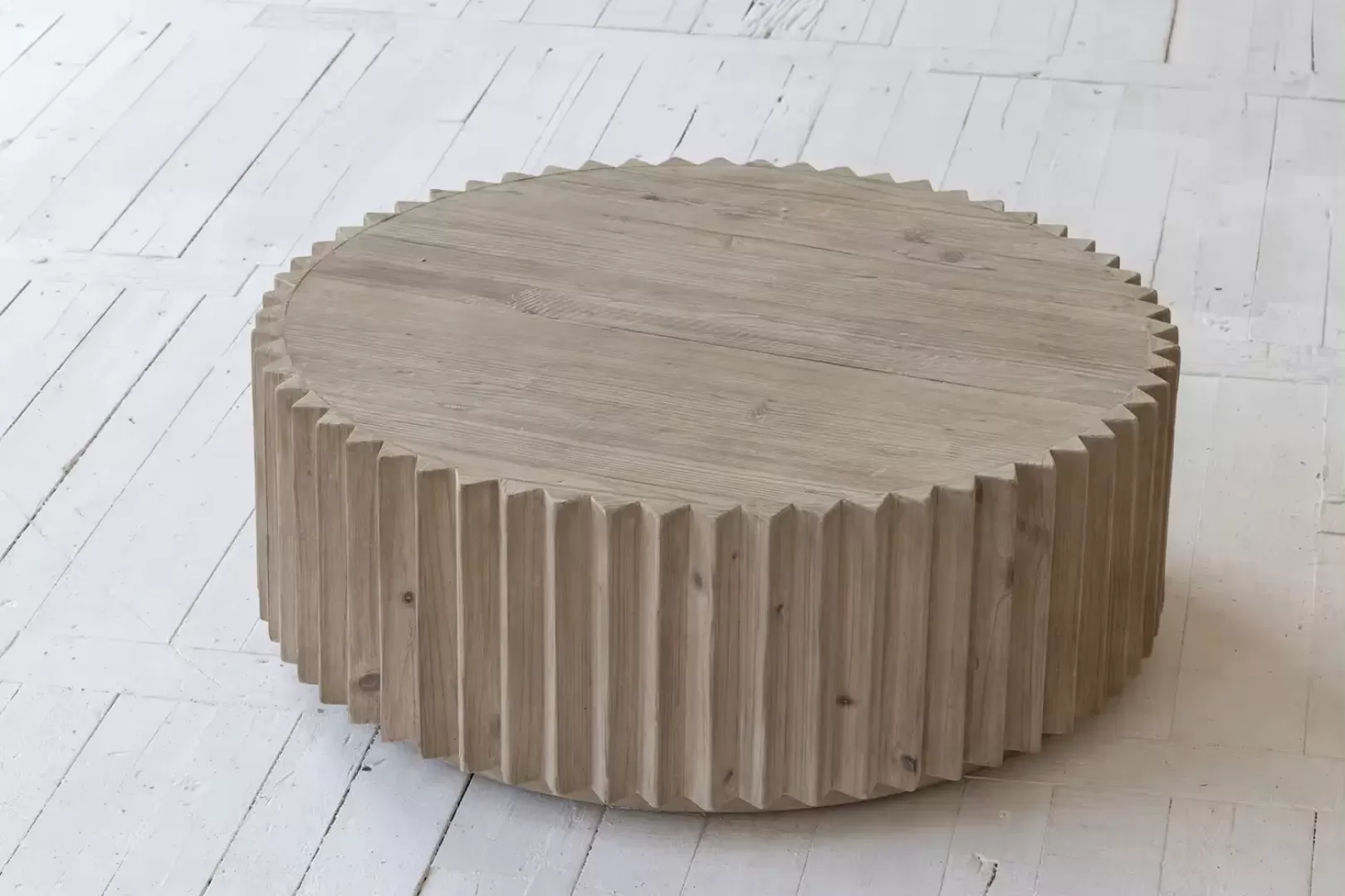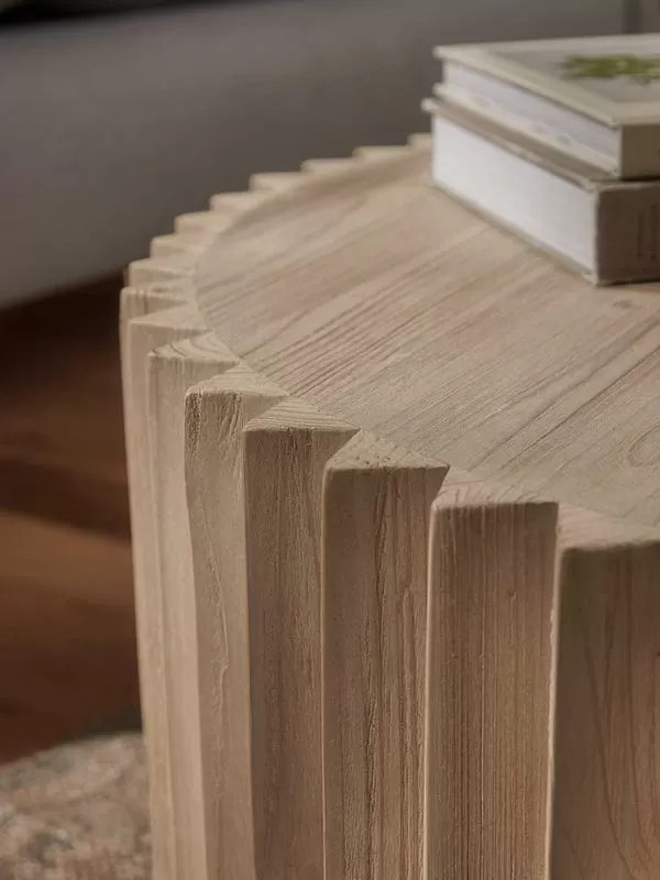 تتميّز هذه الطاولة الدائرية بتصميمها الفريد الذي يجمع بين الطابع الريفي والأناقة المعمارية. السطح المستدير الأملس يتناسق بشكل مثالي مع الجوانب المحفورة بنمط هندسي مميز، مما يمنحها مظهرًا جذّابًا ومريحًا للعين. خامة الخشب الطبيعي تضيف إحساسًا دافئًا وتلقائيًا للمكان.
