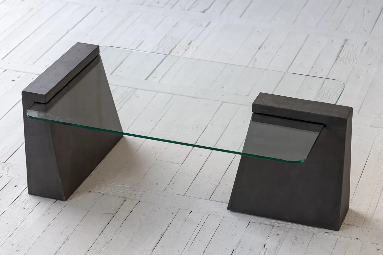 تمزج هذه الطاولة القهوة الزجاج بين الأناقة والتفرّد، من خلال سطح زجاجي شفاف يبدو وكأنه يطفو بين قاعدتين متينتين من الكونكريت الأسود. التصميم الهندسي المائل يمنح الطاولة توازنًا بصريًا وجاذبية نحتية، ما يجعلها مثالية للديكورات الصناعية أو العصرية الراقية.
