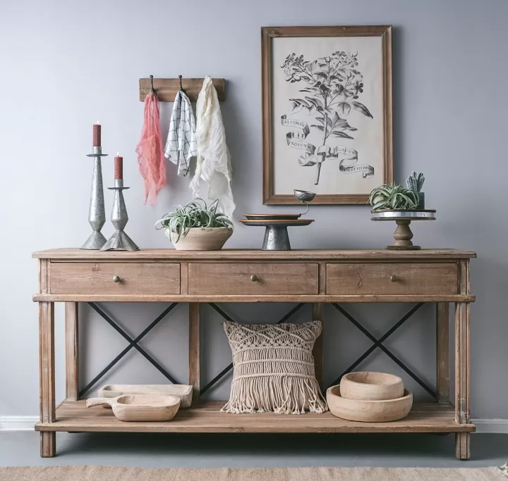 اسم المنتج: طاولة خشب كونسول خشب الصنوبر بثلاثة أدراج وتدعيم معدني - ستايل شابي شيك
