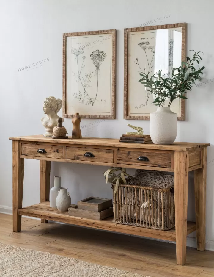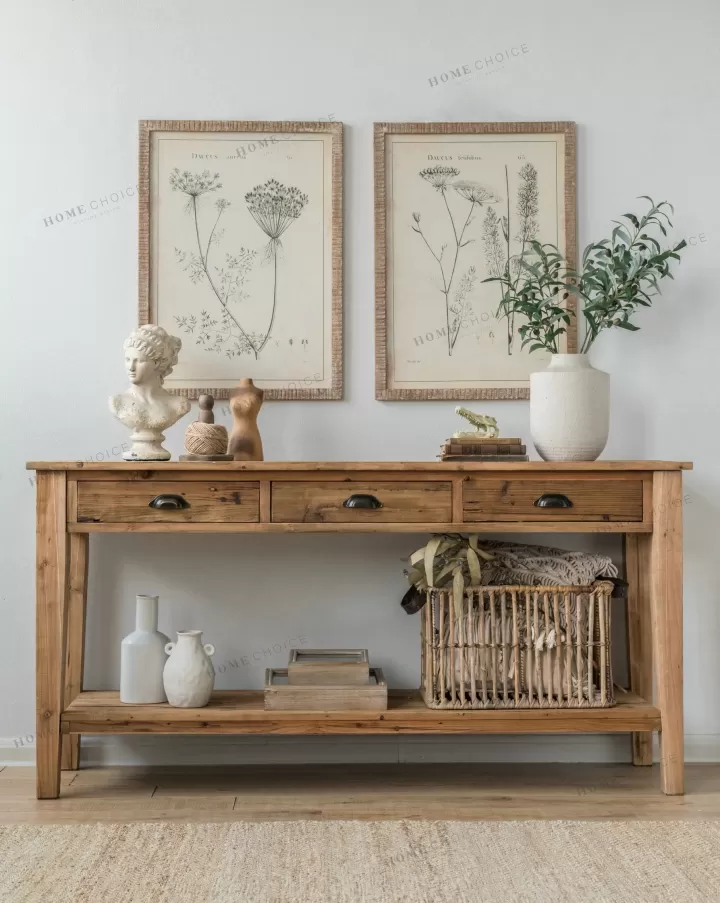 يمثل هذا المدخل كونسول خشب مزيجًا مثاليًا من الجمال العملي. بفضل أدراجه الثلاثة التي توفر مساحة لتخزين الأغراض الصغيرة، والرف السفلي المفتوح الذي يتيح ترتيب السلال أو التحف أو الكتب، يمنحك هذا الكونسول الخشبي تنظيمًا أنيقًا ومساحة عرض جذابة. لونه البني الطبيعي مع مظهر الخشب الحقيقي يعكس دفء التصميم الريفي ولمسة الفخامة الهادئة.