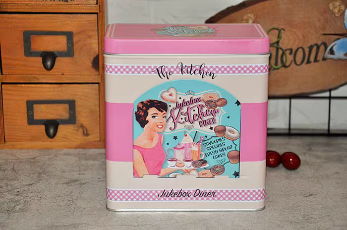 تأتي هذه العلبة المعدنية الفارغة بلون وردي هادئ مع رسومات جذابة تضيف طابعًا مرحًا ولمسة من الذوق القديم، ما يجعلها واحدة من أجمل قطع تنظيم المطبخ المميزة.