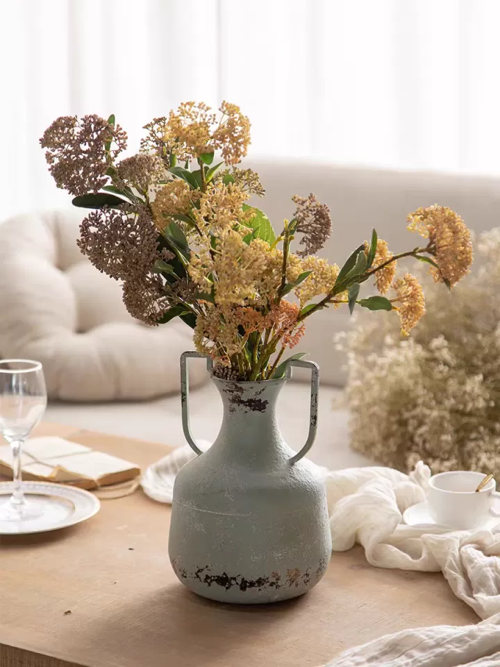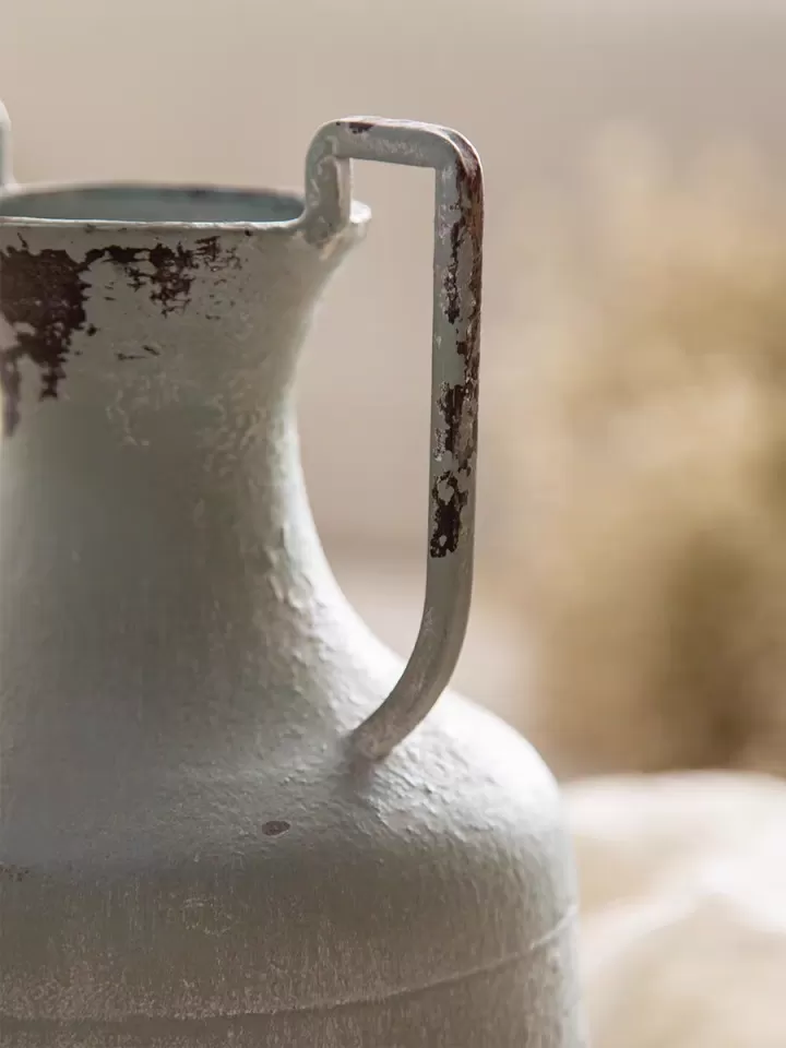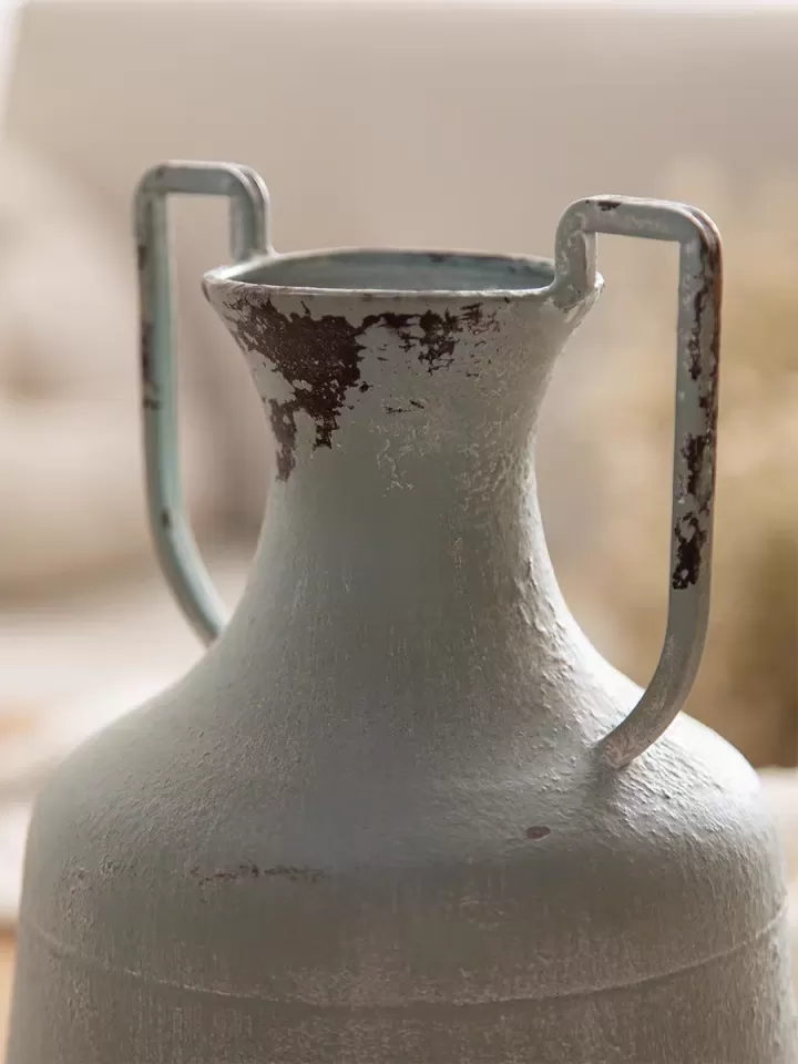 فازة مصنوعة من المعدن بتصميم أنيق ومميز على طراز الشابي شيك (Shabby Chic). تأتي الفازة بارتفاع 27 سم وعرض 18 سم، مما يجعلها بحجم مثالي لإضافة لمسة ريفية فاخرة إلى أي مساحة. تحتوي الفازة على مسكتين أنيقتين من الأعلى لتسهيل الحمل وإضافة لمسة جمالية كلاسيكية. اللون الخارجي يعطي الفازة مظهراً عتيقاً مع لمسات نهائية متآكلة قليلاً لزيادة الطابع الشابي شيك الراقي. تعتبر مثالية لتزيين الطاولات أو الأرفف في المنازل ذات الديكور الريفي أو الكلاسيكي