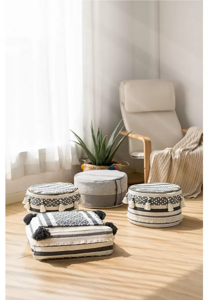 يأتي هذا البوف بألوان طبيعية ونقوش ناعمة مع تفاصيل زخرفية مثل الشراريب والخيوط السميكة، مما يجعله قطعة مميزة تندمج بسلاسة مع أنماط الديكور البوهيمي، الريفي، أو حتى العصري البسيط.