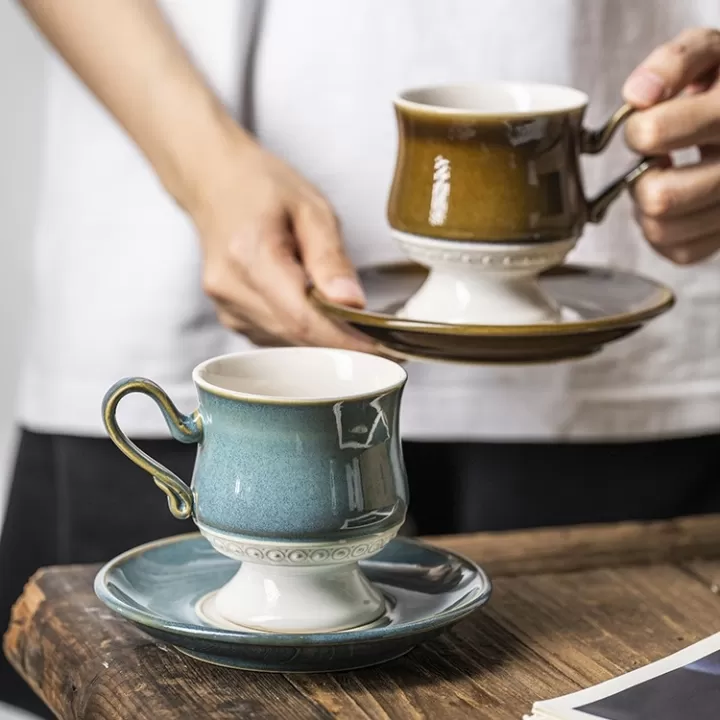 كوب قهوة مع صحن مصنوع من سيراميك فاخر يضمن المتانة وطول الأمد، بالإضافة إلى الحفاظ على حرارة القهوة لفترة أطول.