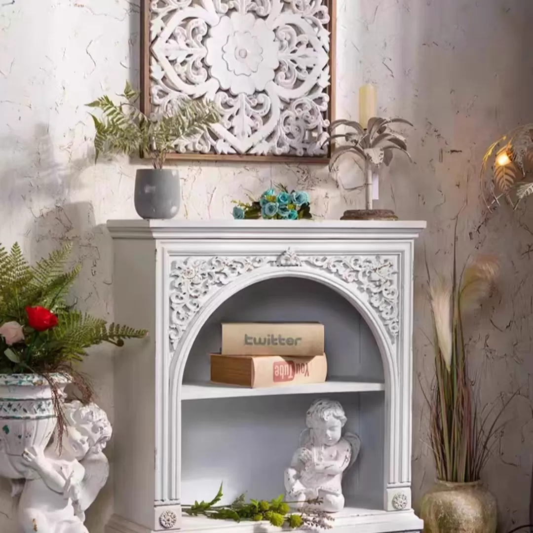 مدخل كونسول أنيق مصنوع من الخشب الطبيعي، مصمم على شكل مكتبة صغيرة بلمسات ستايل الشابي شيك الكلاسيكي، بلون أبيض مطفي يضفي لمسة ناعمة ودافئة على أي مساحة داخلية.
